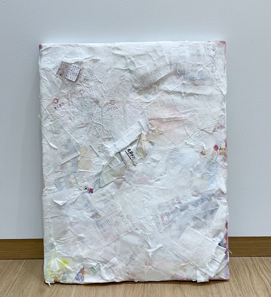 ティッシュを貼る、重ねる、剥がすというプロセスは、私にとって記憶と現実の積み重ねそのものである。一度貼ったものを剥がすことで、過去に描かれた色や形が現れ、自分の過去に触れているような感覚が生まれる。その痕跡をたどる行為は、記憶の層をめくり、可視化する試みでもある。